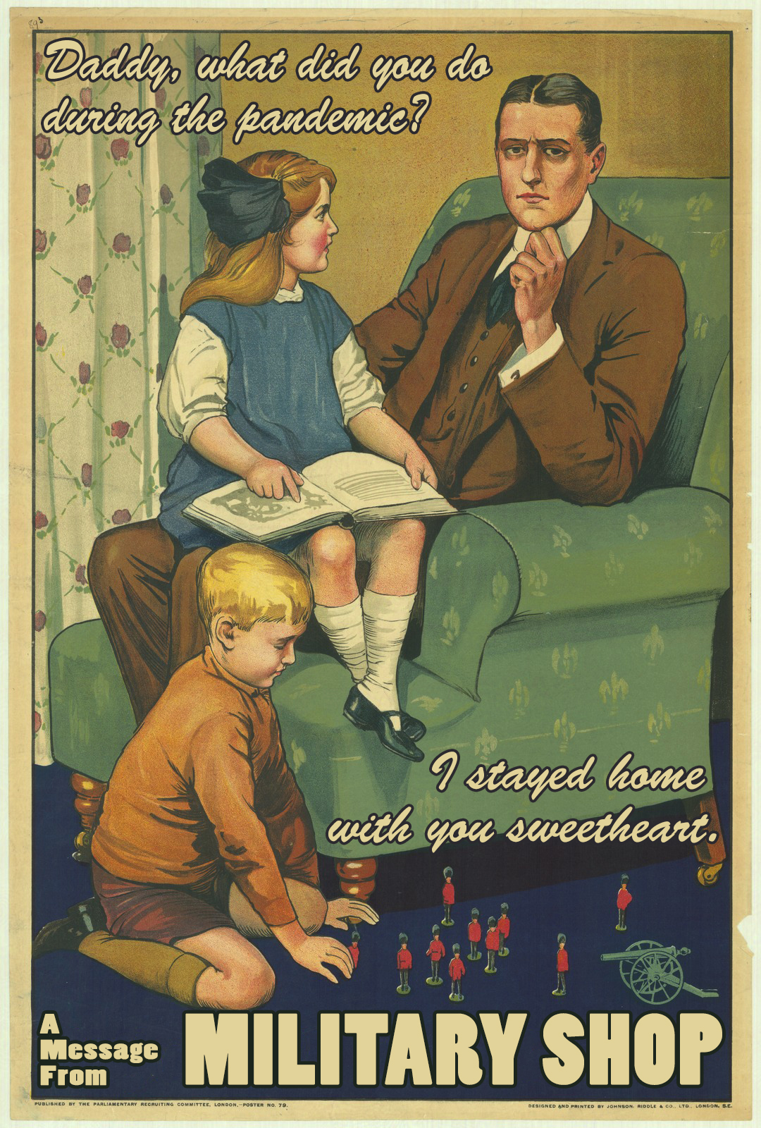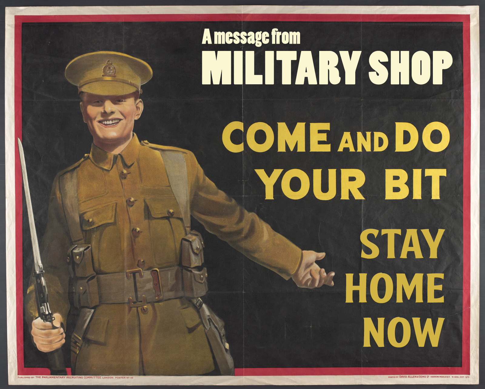 Propaganda posters back in their day were like our social media mass calls to action—the wartime equivalent of an “ice bucket” challenge. As such, here at the Military Shop, we have resurrected some of the more recognisable Great War propaganda posters in an attempt to draw attention the voluntary nature of the current COVID-19 pandemic. While the government is doing what it can to regulate the crisis, the only way to truly overcome the pandemic is through voluntary action. Please protect yourself and others by isolating and share this poster to keep spirits up. Social isolation and extreme hygiene are the necessary steps to win the war. Heed the call. Stand together by standing apart!.