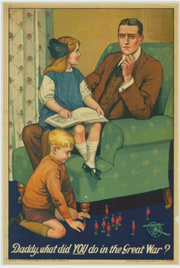 Australia’s force was completely voluntary, but the numbers of volunteers waned after the tragedy of the 1915 Gallipoli campaign and the government twice tried to introduce conscription through referenda in 1916 and 1917. Both failed. So the challenge was left to the creative minds of the time to inspire (or shame) men of fighting-age to answer the call. Propaganda posters popped up across the country.