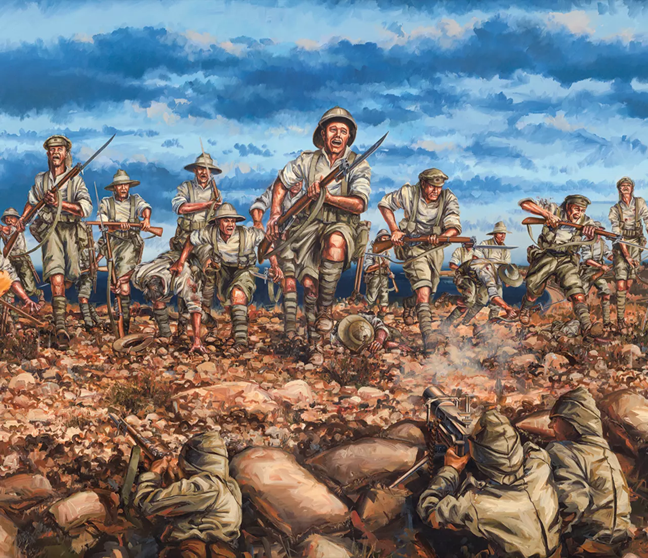 7 August The Battle of the Nek by Drew Harrison. This painting is the result of extensive and painstaking research into the tragic charge of the light horse at The Nek on 7 August 1915. Uniquely depicted from the aspect of the Turkish forward trench, we believe that the painting accurately depicts the early moments of the charge, when the first line of light horsemen hurled themselves across the few metres separating the combatants, only to be bloodily scythed down before they could even reach the enemy lines.