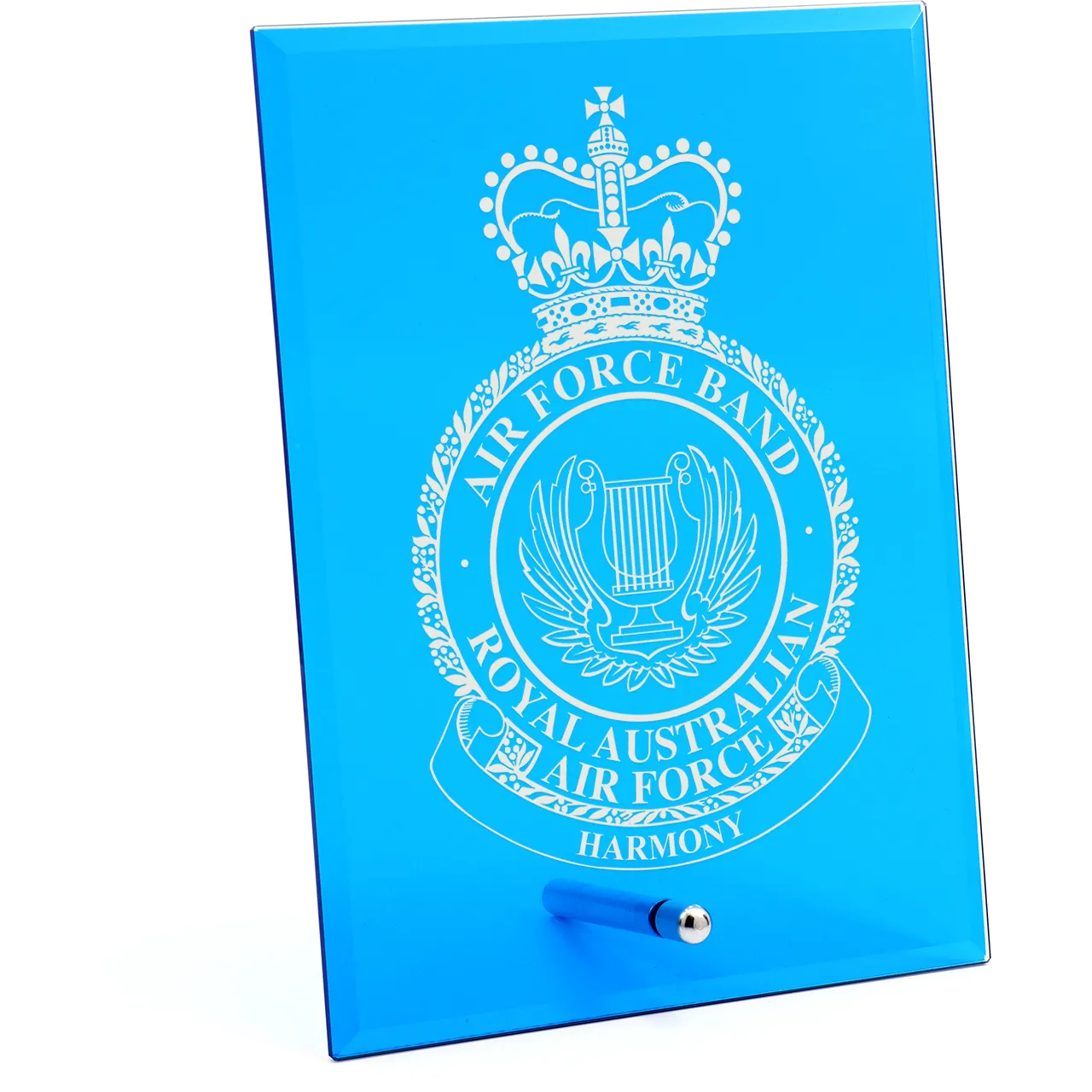The Air Force Band Engraved Nebula Blue Glass Award 200mm in Gift Box is a stunning and affordable choice for your awards. Featuring a sleek metal stand, this award plaque is beautifully presented in a gift box, making it ideal for recognising achievements. Perfect as military presentation gifts and farewell gifts, this elegant glass plaque combines sophistication with a personal touch. Celebrate excellence with this versatile award that honours service and dedication, making it a memorable gift.