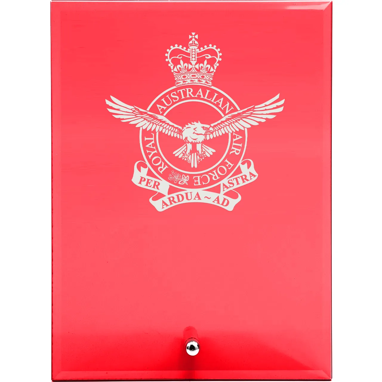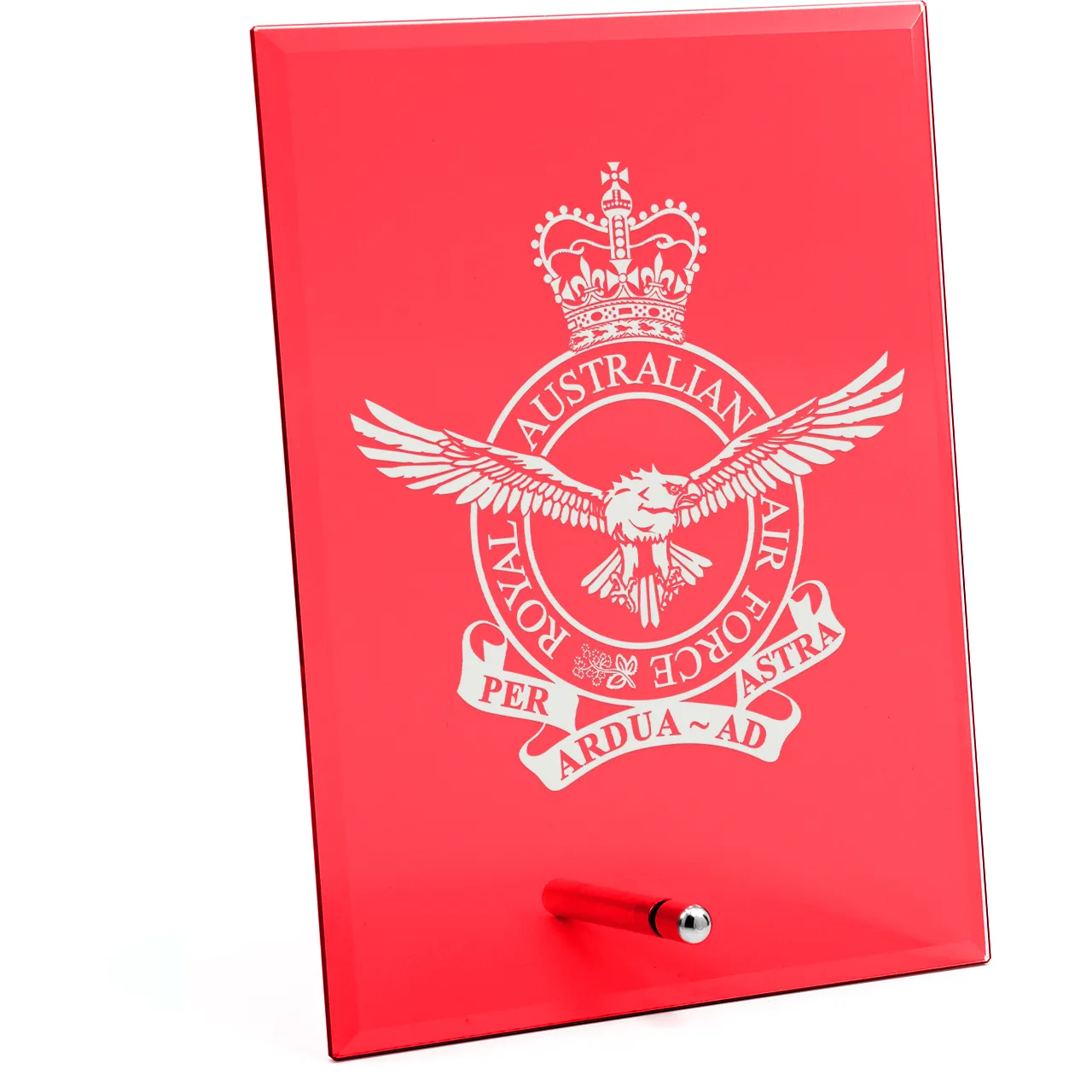 The Air Force Engraved Nebula Red Glass Award 200mm in Gift Box is a stunning and affordable choice for your awards. Featuring a sleek metal stand, this award plaque is beautifully presented in a gift box, making it ideal for recognising achievements. Perfect as military presentation gifts and farewell gifts, this elegant glass plaque combines sophistication with a personal touch. Celebrate excellence with this versatile award that honours service and dedication, making it a memorable gift.