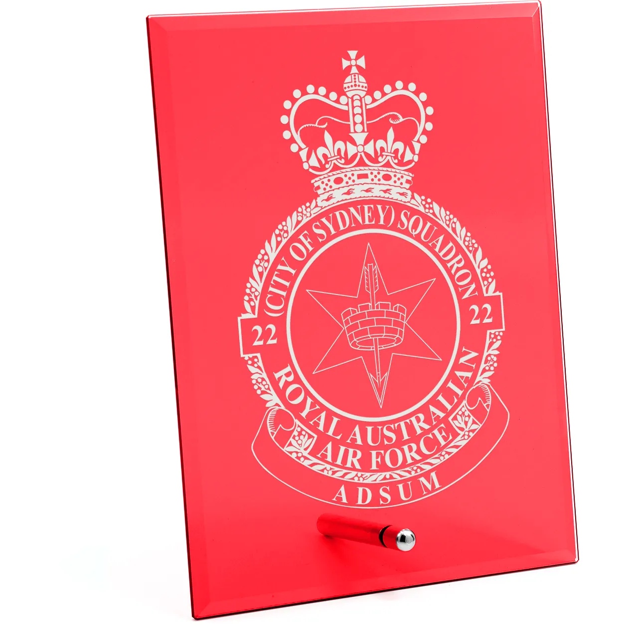 The No 22 (City of Sydney) Squadron (22SQN) Engraved Nebula Red Glass Award 200mm in Gift Box is a stunning and affordable choice for your awards. Featuring a sleek metal stand, this award plaque is beautifully presented in a gift box, making it ideal for recognising achievements. Perfect as military presentation gifts and farewell gifts, this elegant glass plaque combines sophistication with a personal touch. Celebrate excellence with this versatile award that honours service and dedication, making it a memorable gift.