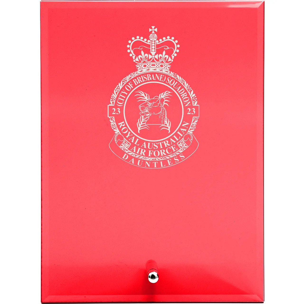 The No 23 (City of Brisbane) Squadron (23SQN) Engraved Nebula Red Glass Award 200mm in Gift Box is a stunning and affordable choice for your awards. Featuring a sleek metal stand, this award plaque is beautifully presented in a gift box, making it ideal for recognising achievements. Perfect as military presentation gifts and farewell gifts, this elegant glass plaque combines sophistication with a personal touch. Celebrate excellence with this versatile award that honours service and dedication, making it a memorable gift.