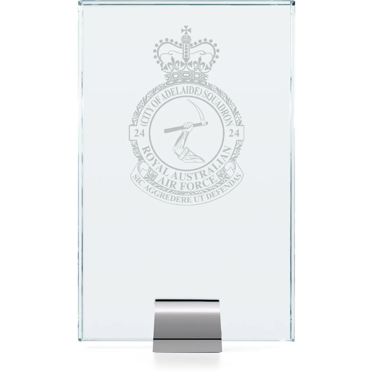 The No 24 (City of Adelaide) Squadron (24SQN) Engraved Alpha Glass Award 205mm is perfect for military ceremonies, recognising exceptional service and achievements. The detachable metal base adds versatility, allowing for easy display options. Ideal as a military presentation gift or farewell gift, this plaque combines sophistication with significance. Celebrate dedication and excellence with this unique award that honours the commitment of our servicemen and women.