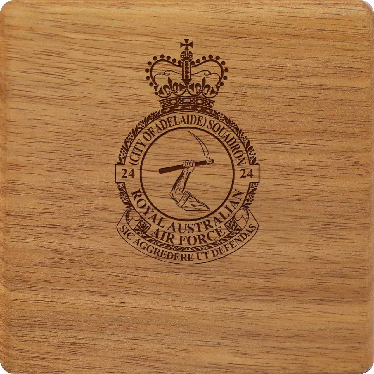 Handcrafted No 24 (City of Adelaide) Squadron (24SQN) Tasmanian Blackwood Heritage Box with velvet lining and custom engraving. Read more..