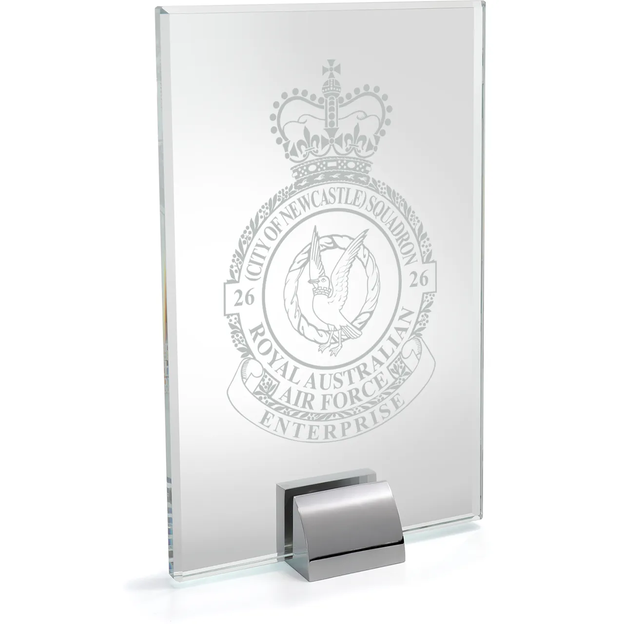 The No 26 (City of Newcastle) Squadron (26SQN) Engraved Alpha Glass Award 205mm is perfect for military ceremonies, recognising exceptional service and achievements. The detachable metal base adds versatility, allowing for easy display options. Ideal as a military presentation gift or farewell gift, this plaque combines sophistication with significance. Celebrate dedication and excellence with this unique award that honours the commitment of our servicemen and women.