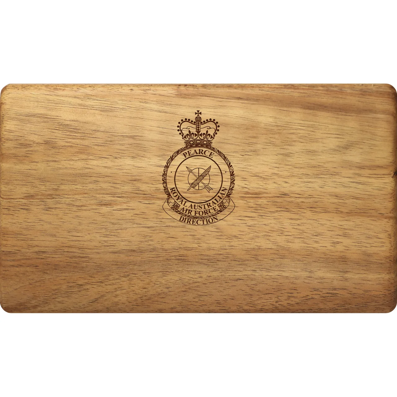The laser engraved RAAF Base Pearce (RAAFPEA) Tasmanian Blackwood Two-Tiered Medal Display Box is a sophisticated and functional piece designed to showcase your most cherished awards and honours. Ideal as a ceremonial gift or commemorative presentation, it offers both beauty and meaning in one elegant piece. Crafted from premium Tasmanian Blackwood (Acacia melanoxylon), the box features the timber’s rich, dark hues and natural grain patterns, ensuring each piece is unique. The two-tiered design allows for organised display, with ample space to accommodate multiple medals and mementos. The velvet-lined interior offers a soft, protective space for your treasured items, while the elegant construction enhances the box's overall aesthetic. Sustainably sourced and PEFC Certified, this box exemplifies fine craftsmanship and respect for the environment.